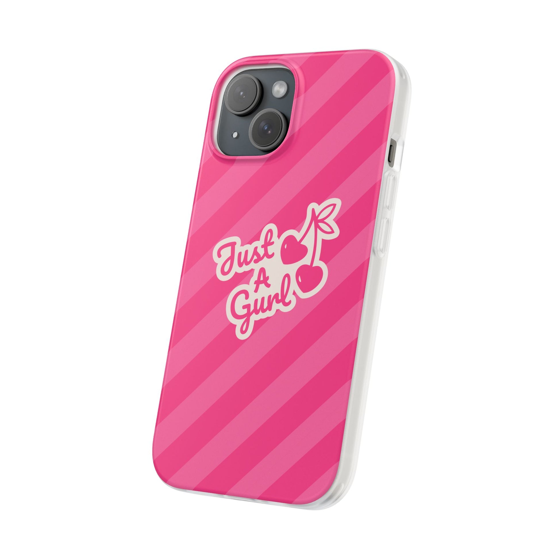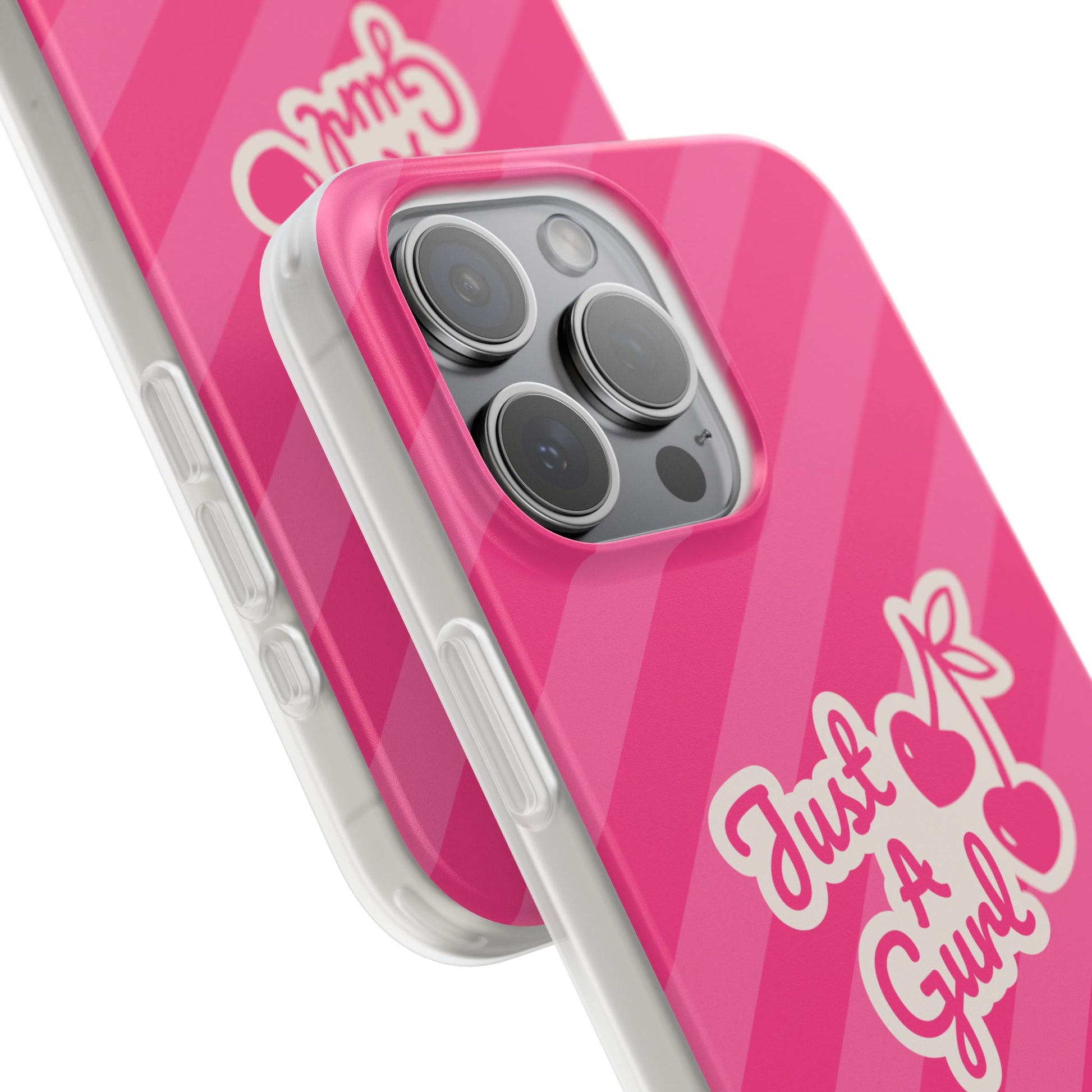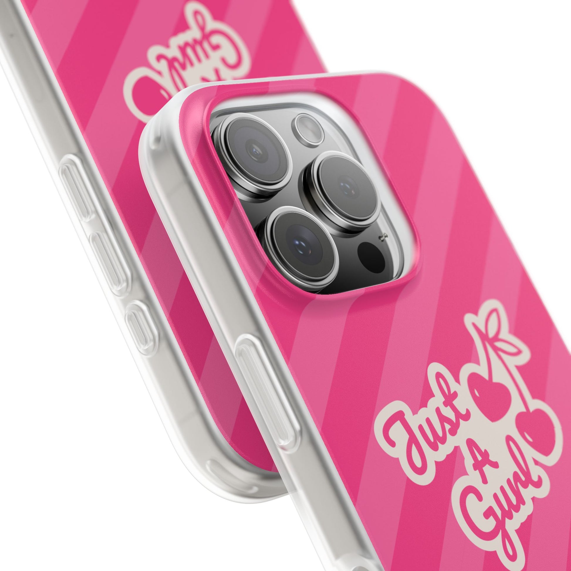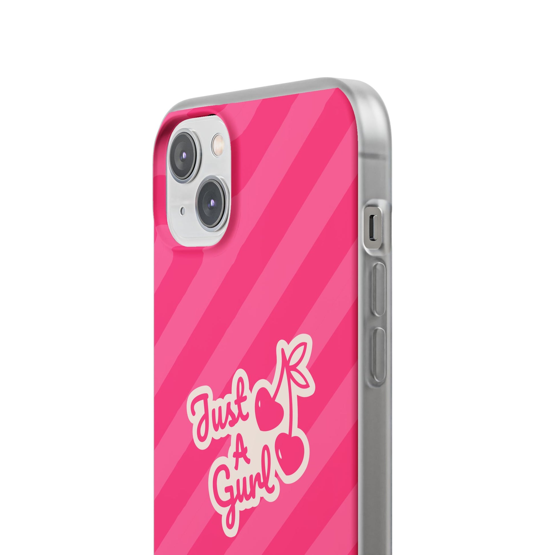- The Look: Semi-transparent frosted TPU with those iconic Just A Gurl stripes and a bold cherry print.