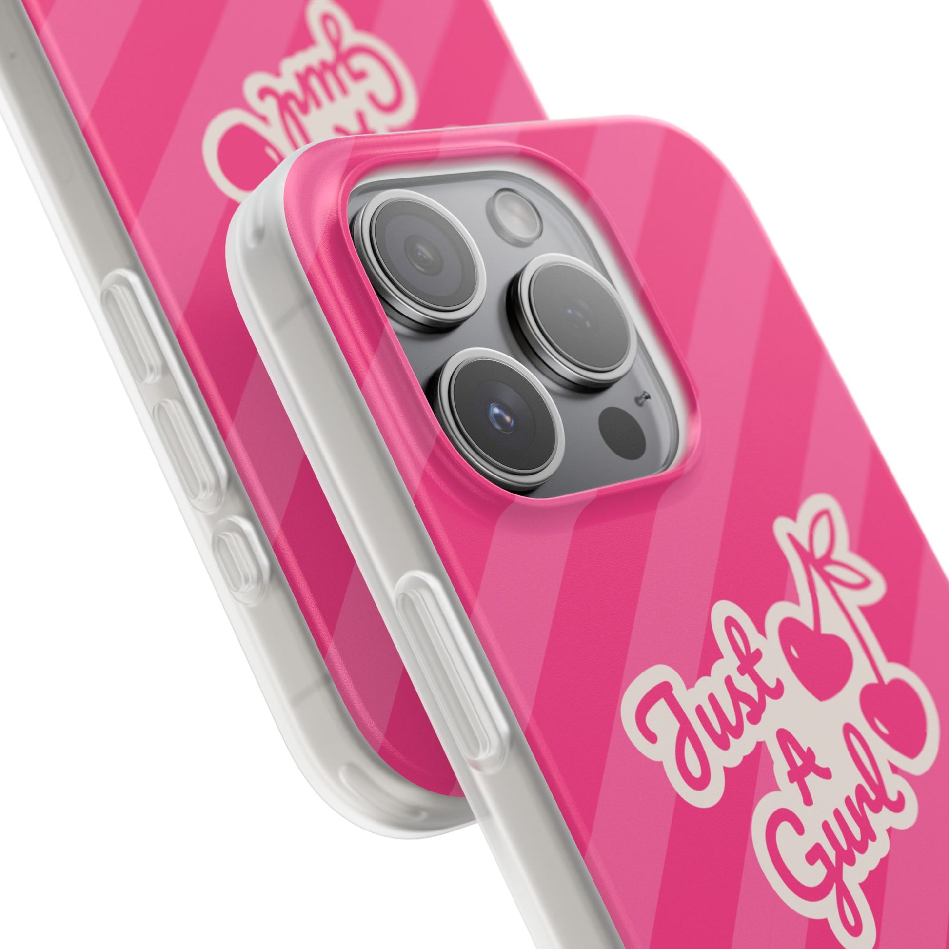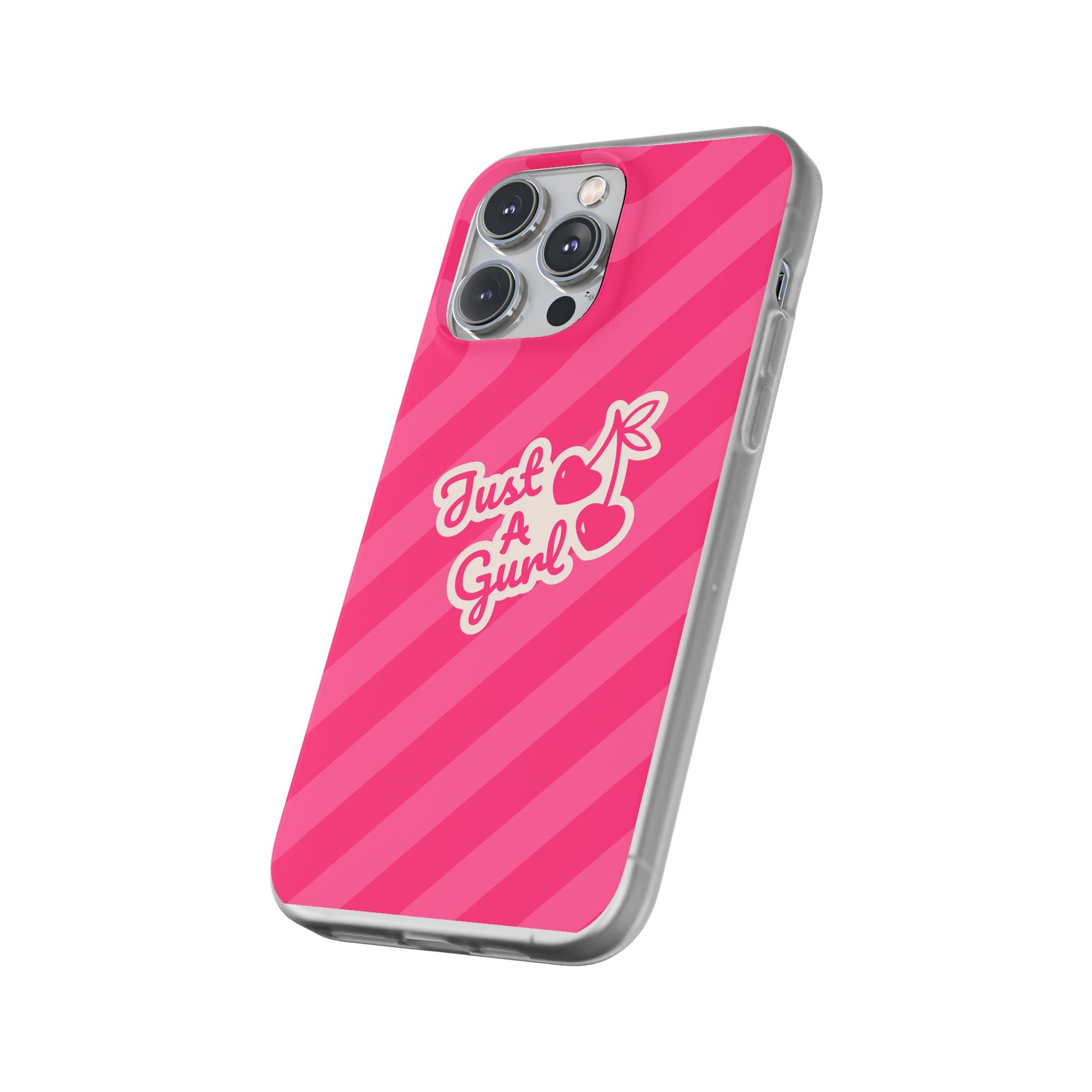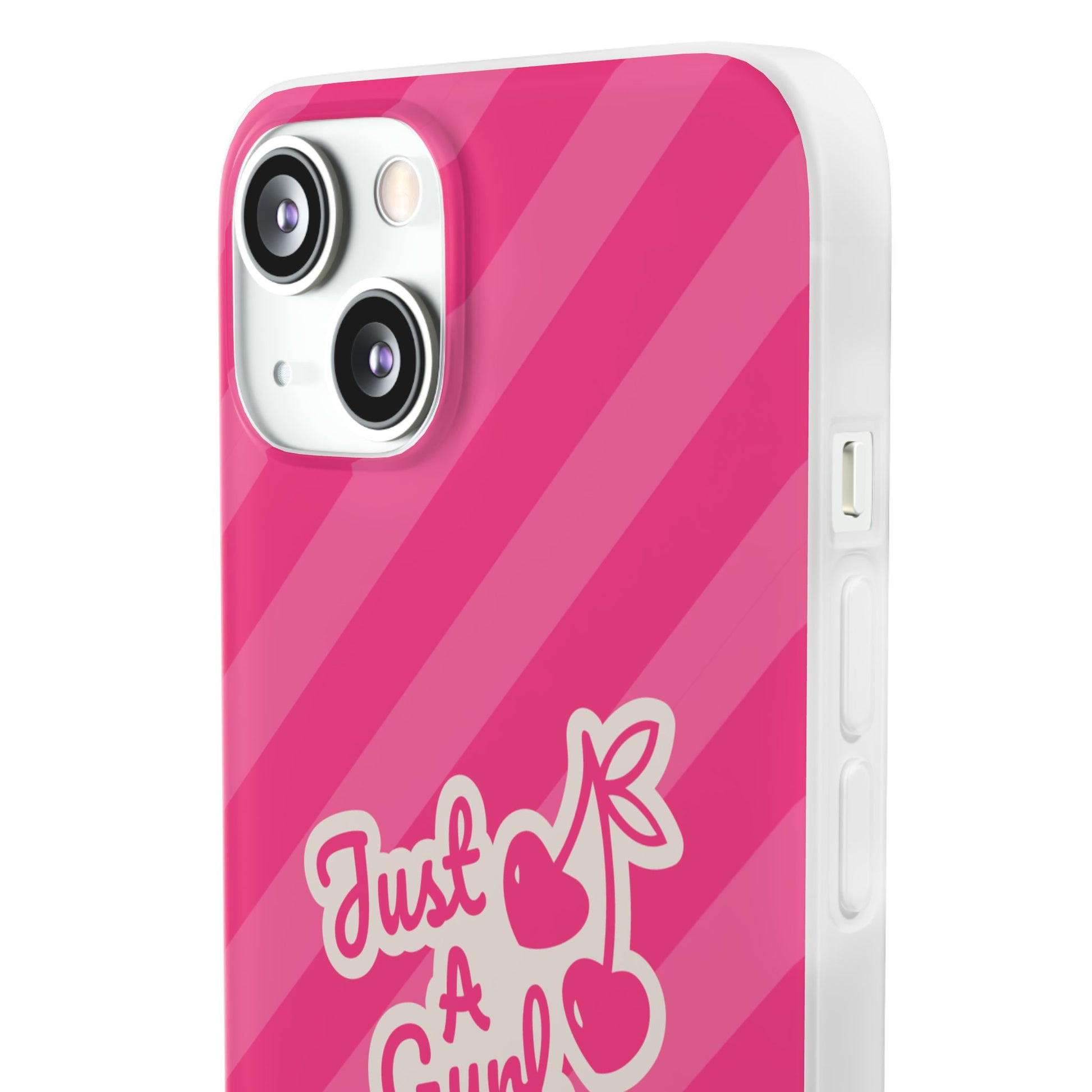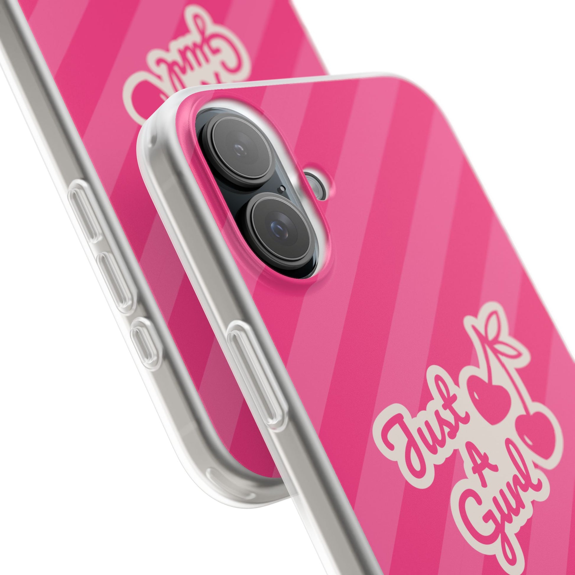 - The Look: Semi-transparent frosted TPU with those iconic Just A Gurl stripes and a bold cherry print.