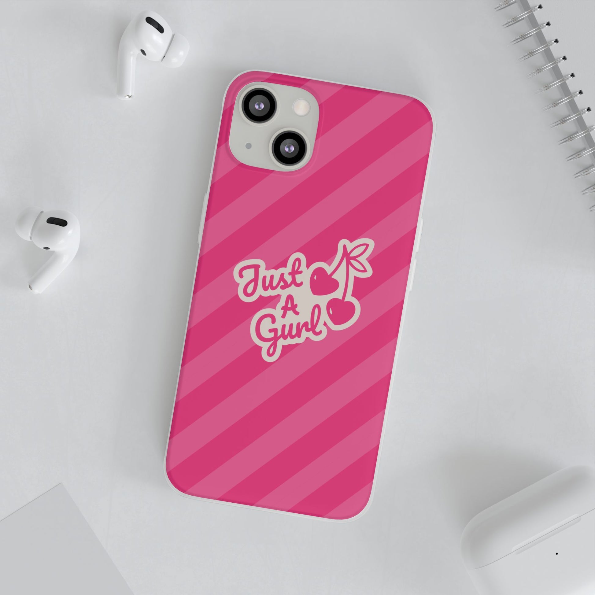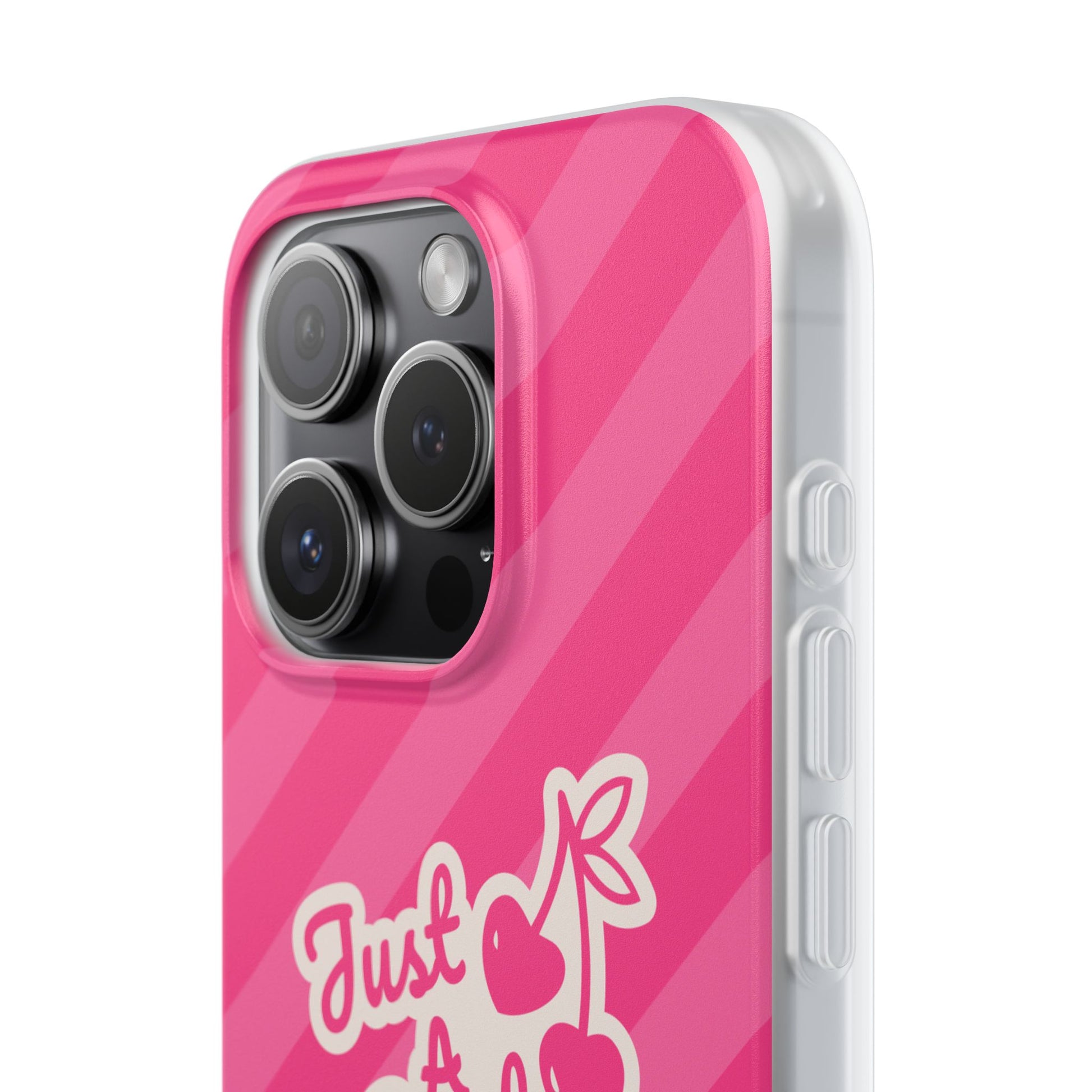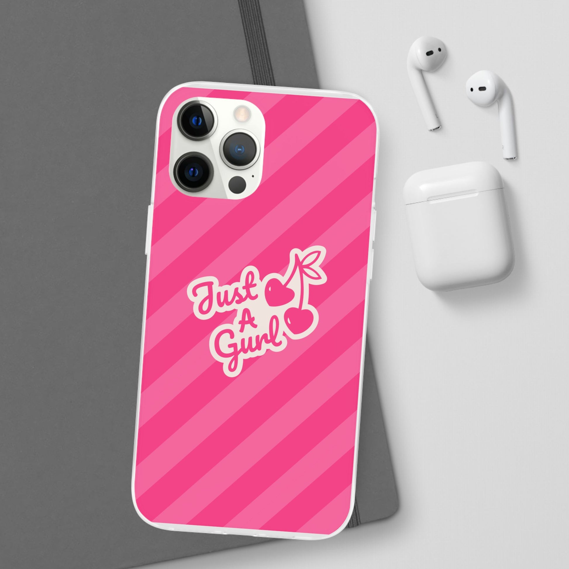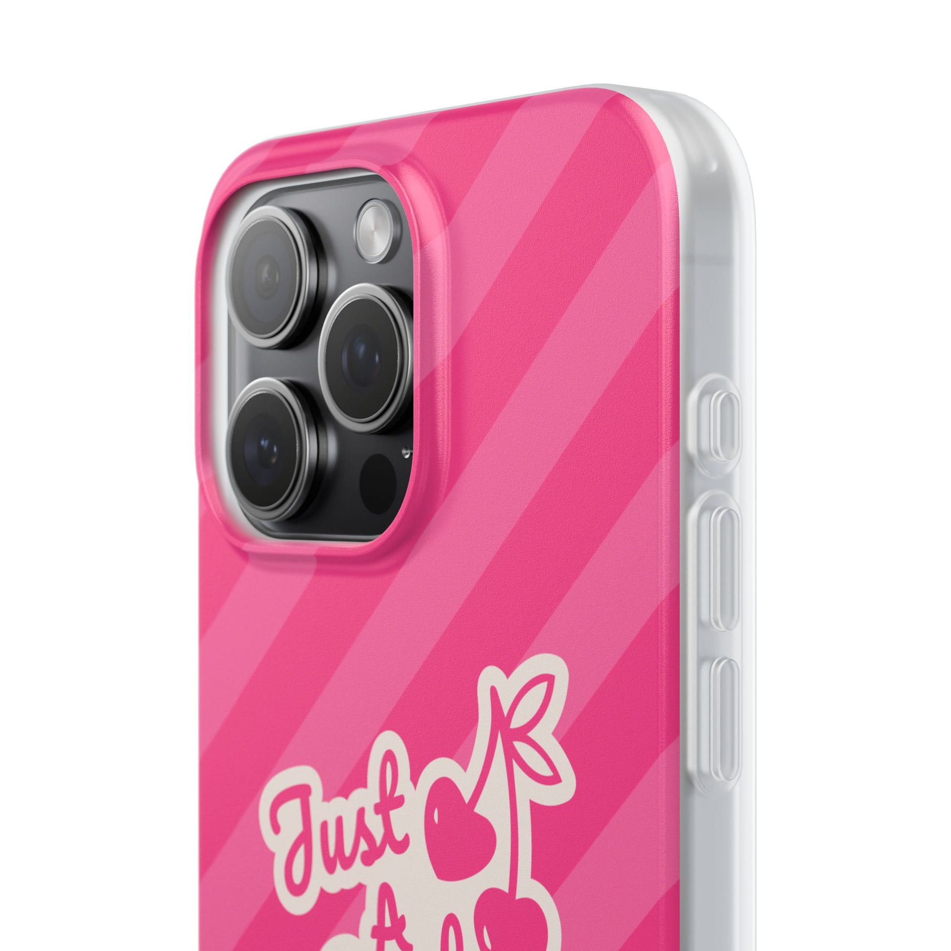 - The Look: Semi-transparent frosted TPU with those iconic Just A Gurl stripes and a bold cherry print.